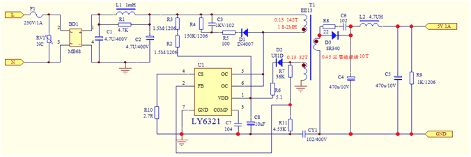 充電器適配器原邊反饋5V* 1A=5W典型應(yīng)用電路圖